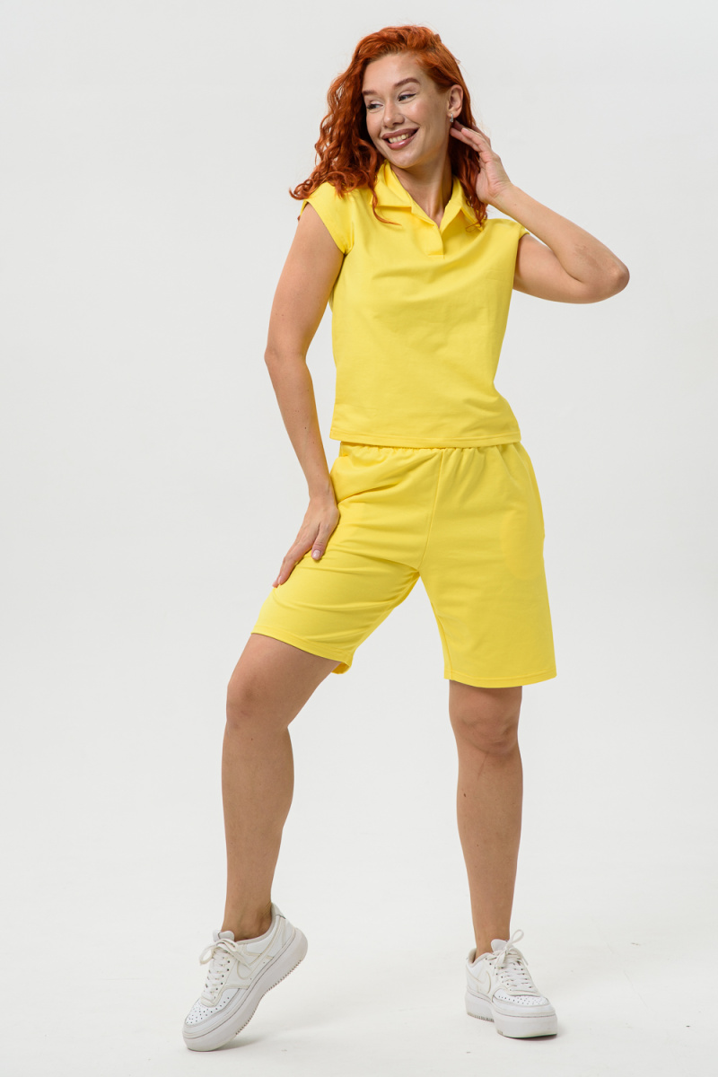 Летний костюм - жилет и шорты. Жилет с воротником "поло" с цельнокроенными подбортами и отстрочкой до линии плеча. Лёгкий лаконичный полуприлегающий жилет со спущенной линией плеча мягко драпируется на линии талии. Шорты с высокой посадкой, пояс прошит на поясной машине. В боковых швах внутренние карманы. Этот стильный костюм подходит для путешествий, прогулок, повседневного использования.