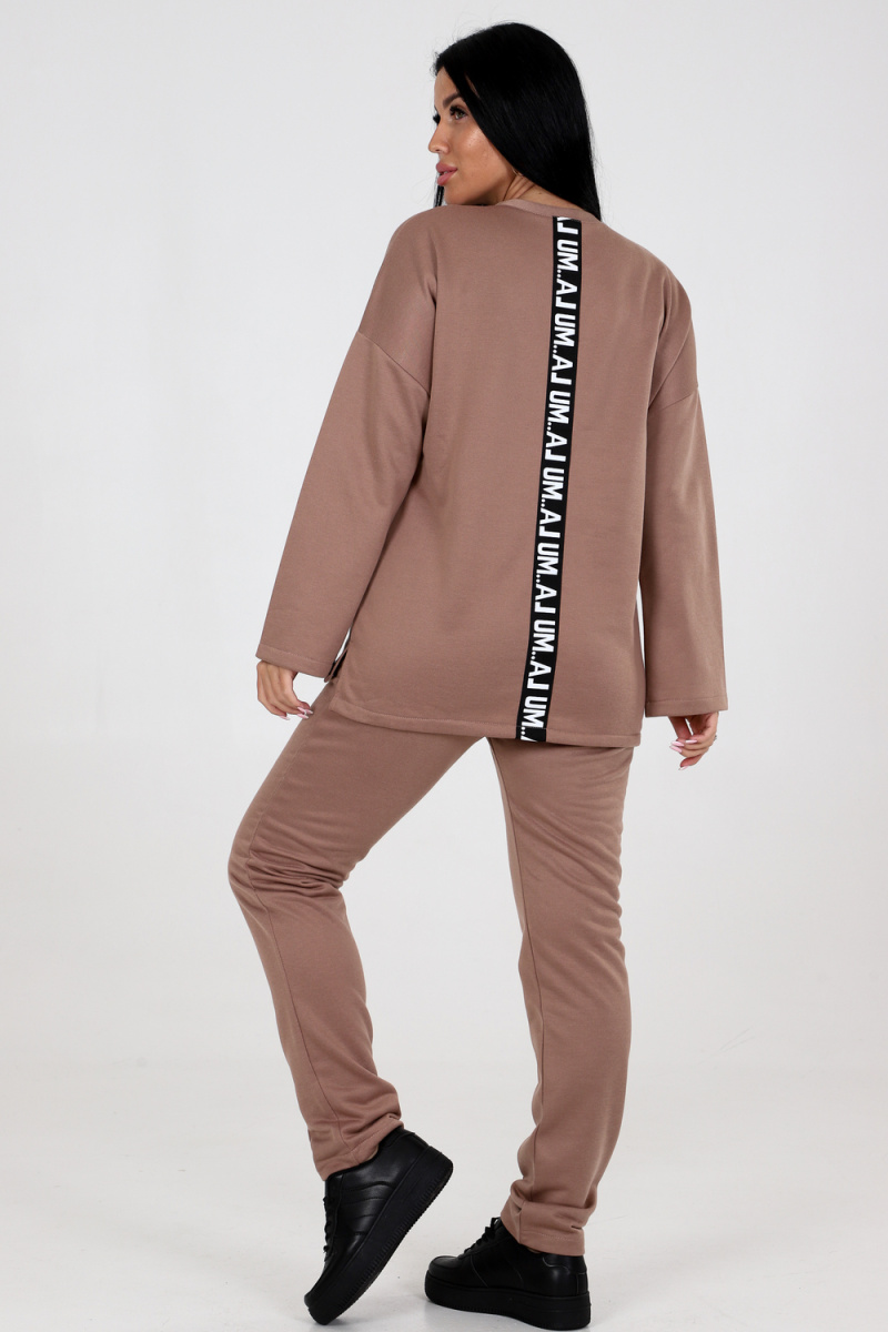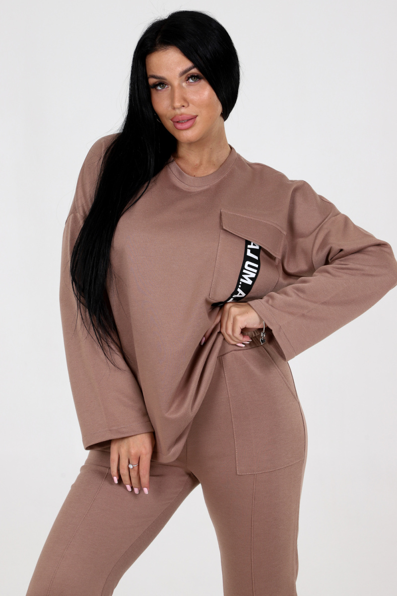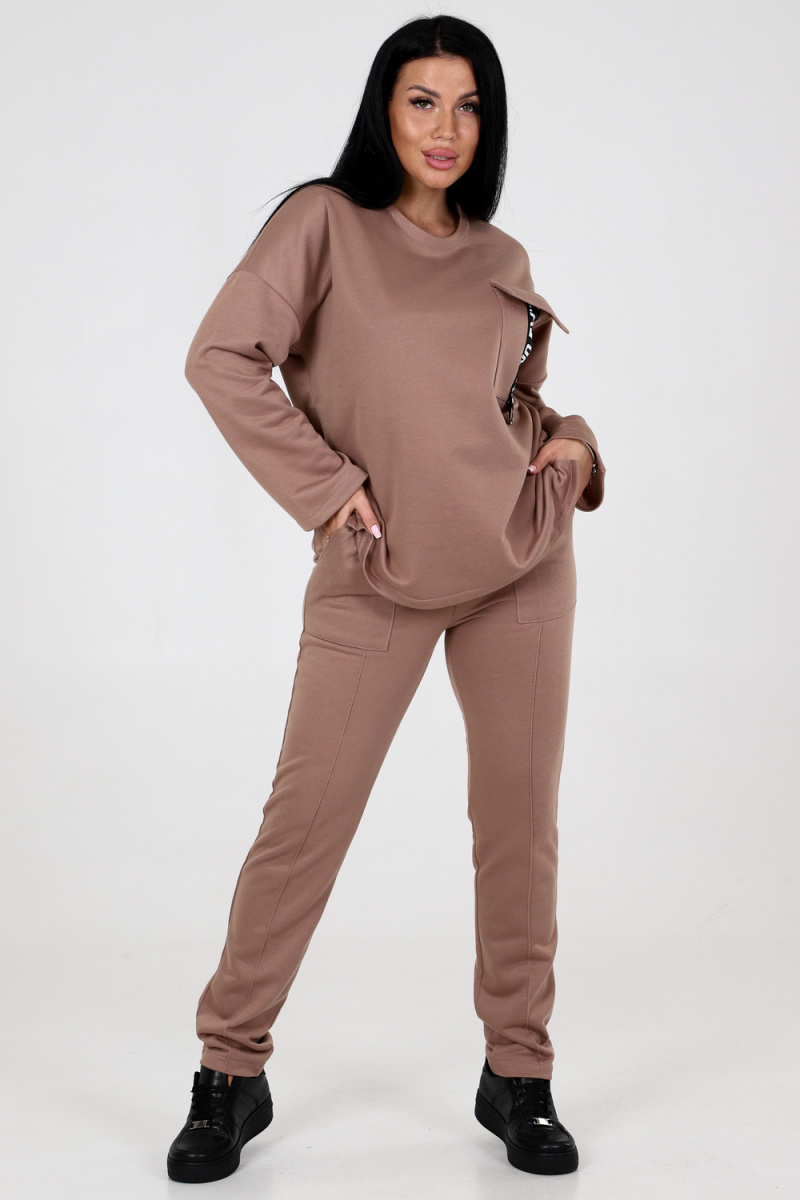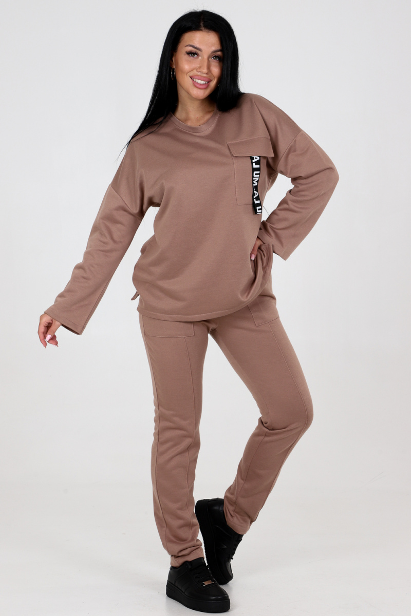 Женский костюм двойка с брюками представляет собой идеальное сочетание стиля и комфорта. Изготовленный из прочной и мягкой трех нитки, этот костюм обеспечивает идеальное сочетание прочности и приятности на ощупь. Туника костюма имеет свободный крой, который позволяет свободно двигаться и не сковывает движения. На полочке туники расположен практичный нагрудный карман, который поможет хранить необходимые мелочи под рукой. Декоративная лента, пришитая по карману и по спинке изделия, придает цельности и оригинальности этому стильному костюму. Особенности полочки изделия, которая короче спинки, и боковые разрезы придают дополнительную элегантность и легкость образу. Кроме того, спущенные рукава делают этот костюм еще более стильным и привлекательным. Брюки костюма имеют удобную резинку, благодаря чему идеально садятся на фигуру и не стесняют движения. Боковые карманы обеспечивают дополнительный комфорт и функциональность. Костюм доступен в двух привлекательных расцветках: коричневой и бирюзовой. Выбирайте цвет, ко