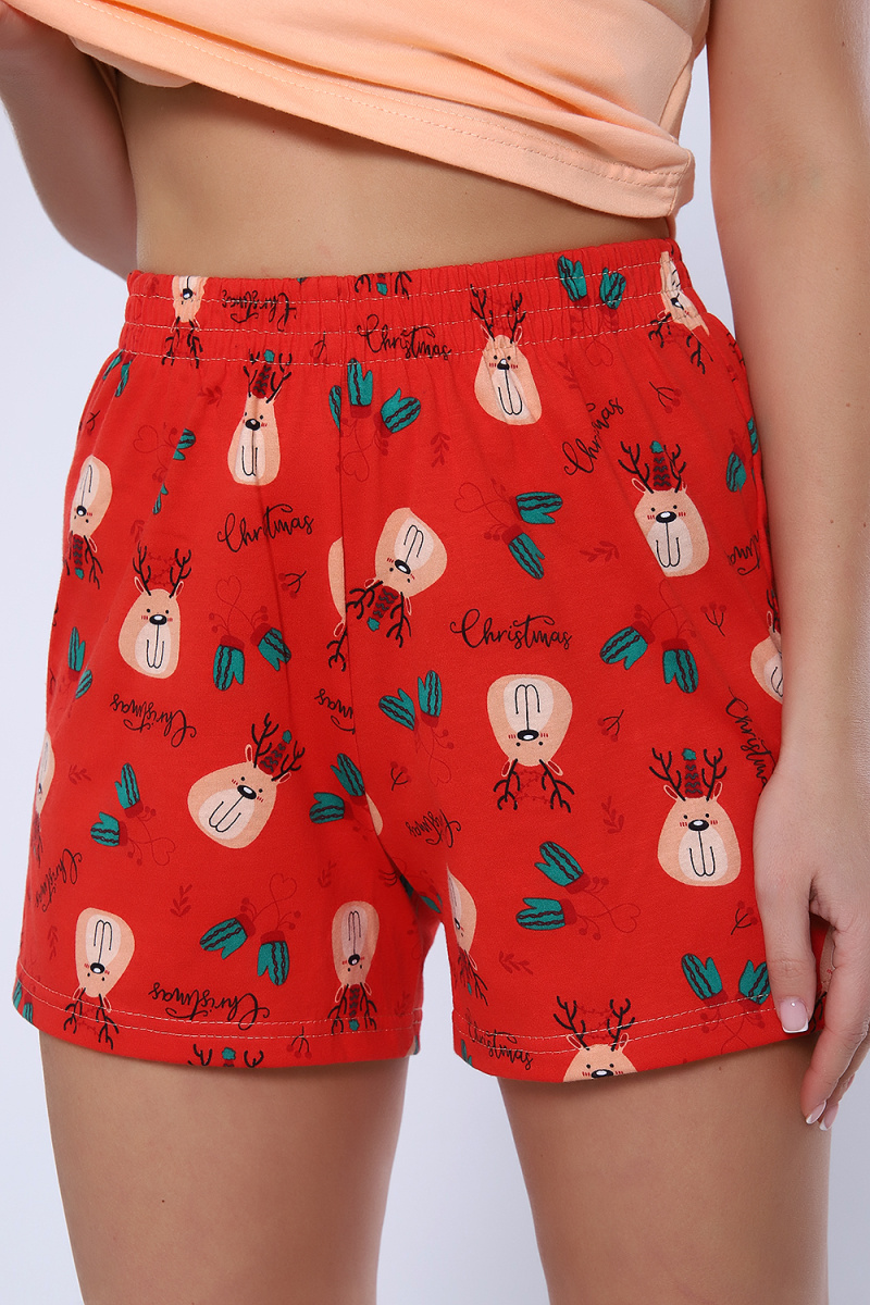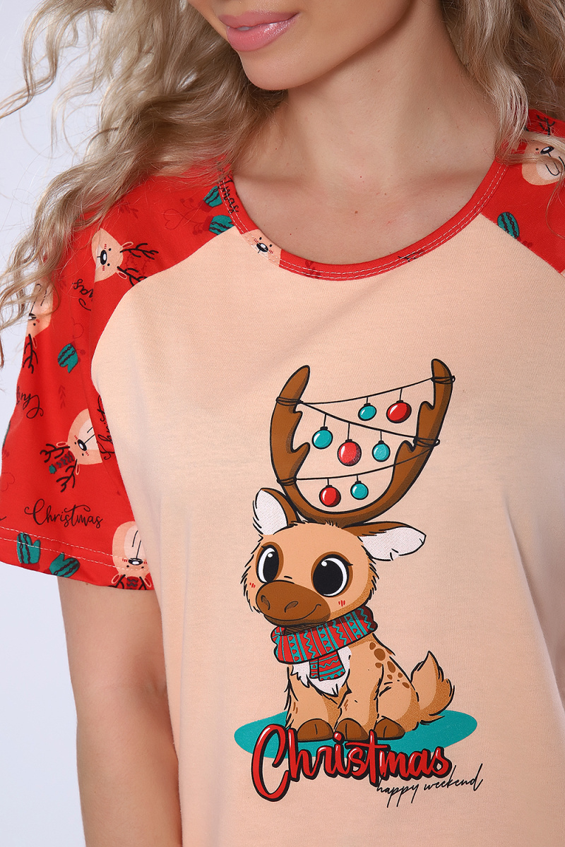 Костюм домашний состоит из футболки и шорт. Футболка с короткими рукавами реглан и принтом. Удобный и практичный вариант для дома и сна.